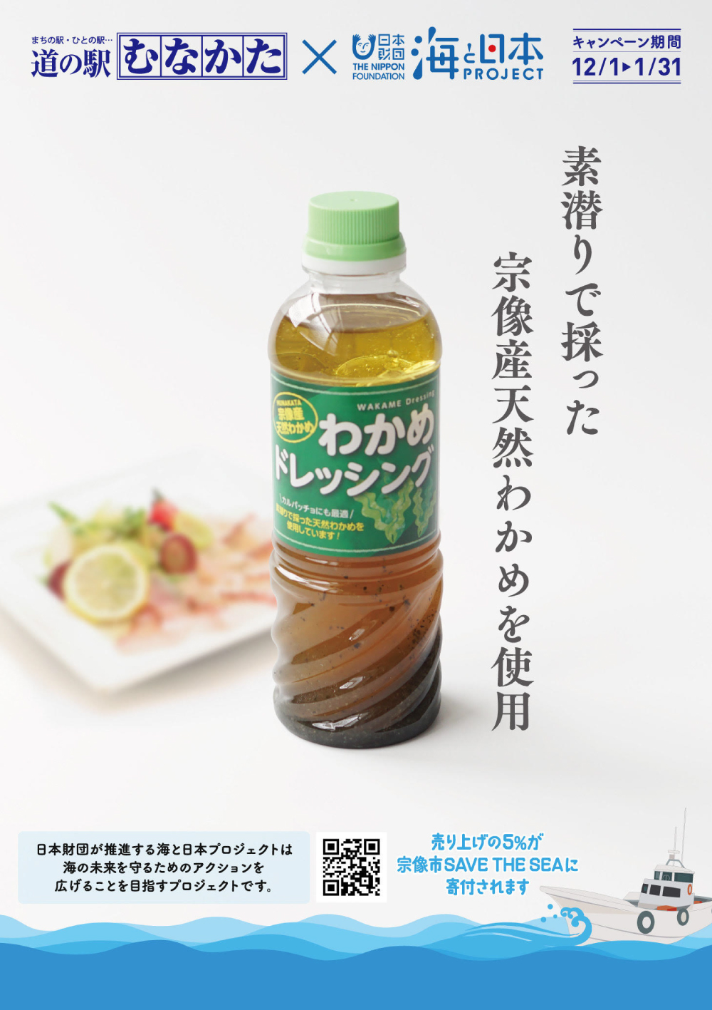 海と日本プロジェクトinふくおかと道の駅むなかたの商品コラボ企画「食べて応援!むなかた海守り隊・わかめドレッシング」。