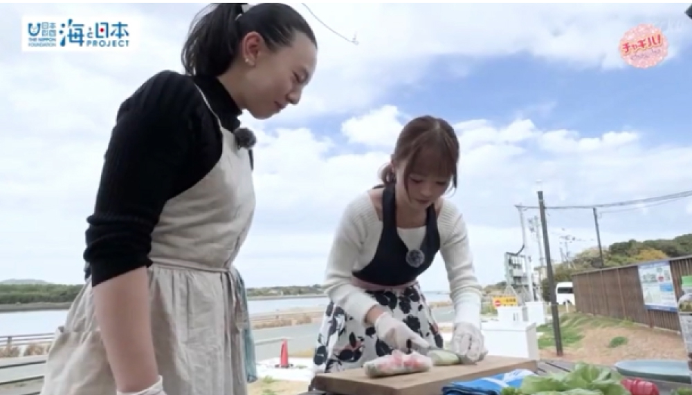 大庭凜咲(HKT48)リポーターも試食会の準備をお手伝い。料理研究家・佐藤彰子先生の指導で「魚の生春巻きサラダ~わかめドレッシング添え~」を作ってみました!😆